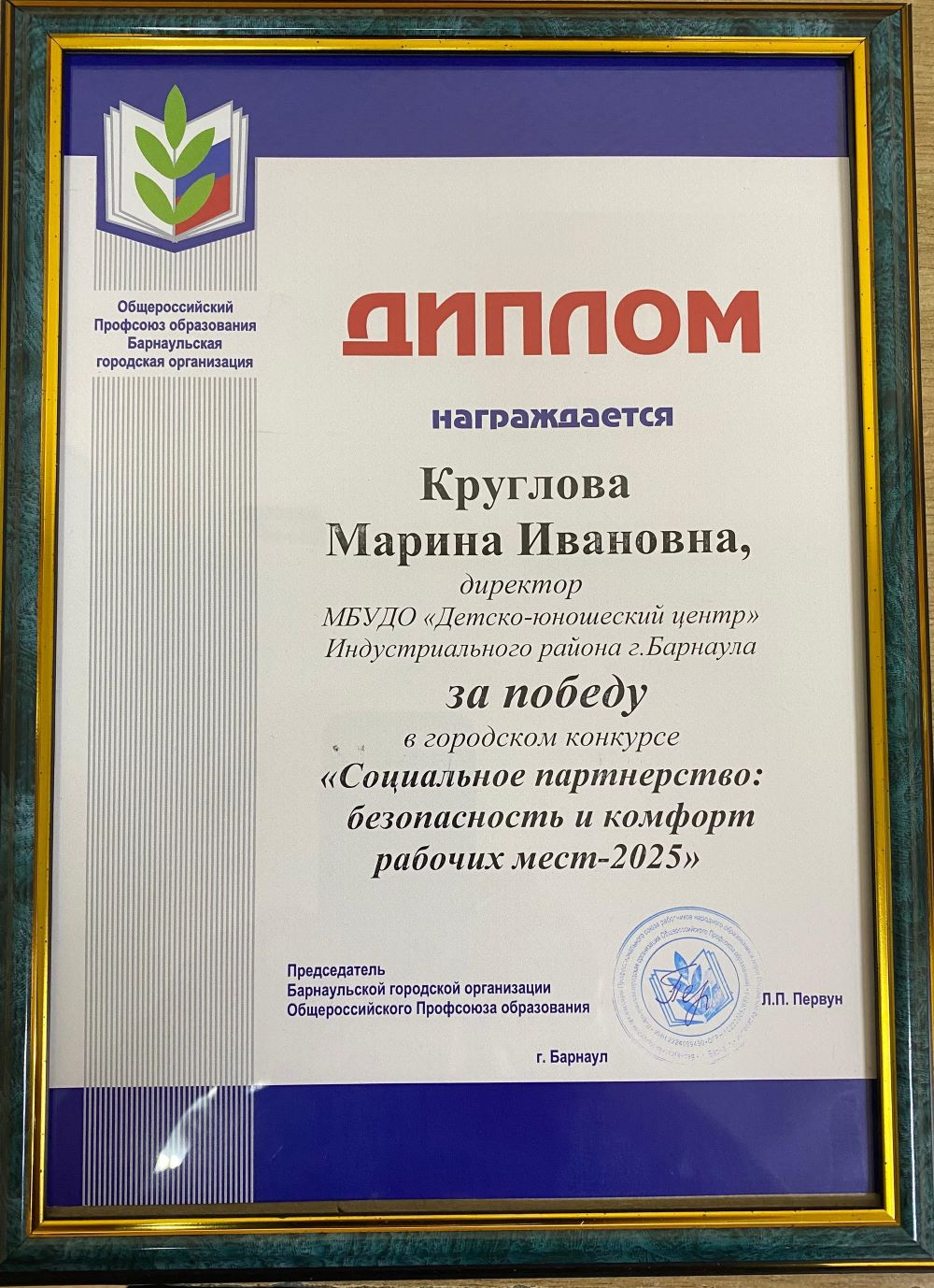 На сентябрьских совещаниях руководителей образовательных организаций, торжественно с вручением дипломов, подарков и профсоюзных премий, подведены итоги конкурса смотра – конкурса «Социальное партнерство: безопасность и комфорт рабочих мест-2025». Первичные профсоюзные организации за активную работу по подготовке образовательных организаций к новому учебному году поощрены подарочными сертификатами на одну путевку для члена профсоюза в санаторий "Барнаульский". Марина Ивановна Круглова, директор нашего центра, вошла в число победителей этого конкурса.