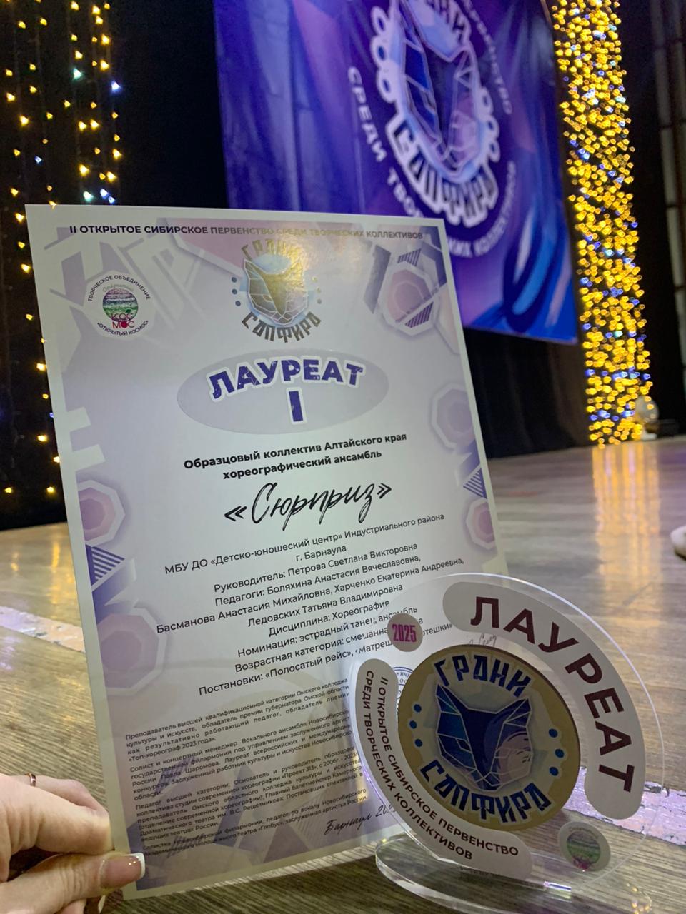 В минувшие выходные 47 воспитанников Образцового самодеятельного коллектива Алтайского края, хореографического ансамбля «Сюрприз» приняли участие во II открытом Сибирском первенстве среди творческих коллективов «Грани сапфира», проводимом в ДК «Южный». В данном конкурсе состязались десятки творческих коллективов по 6 направлениям.